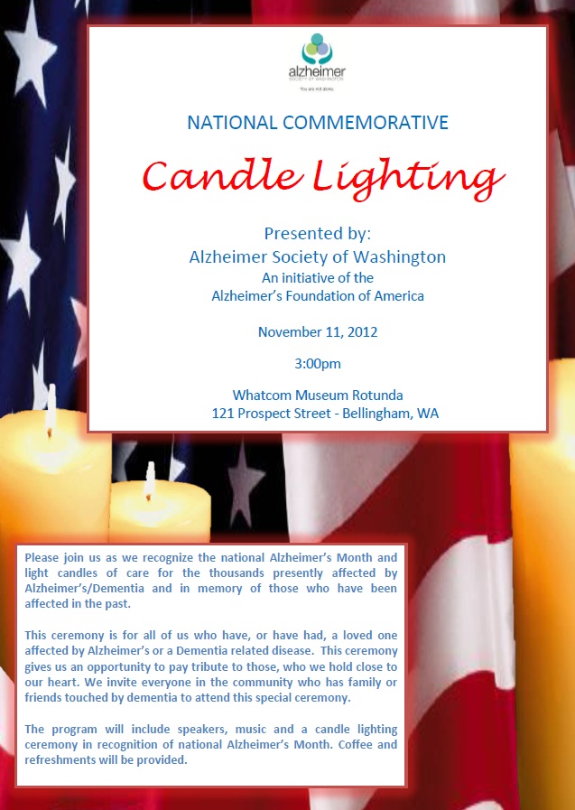 Alzheimer Society of Washington is hosting a candle lighting ceremony in Bellingham to recognize National Alzheimer’s Month. Please join them on November 11, 2012 as they light ‘candles of care’ for those impacted by Alzheimer’s and other forms of dementia.